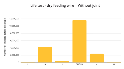 En test udført af Teknologisk Institut afslørede markant længere levetid på SKIOLD wire sammenlignet med konkurrerende alternativer, som det fremgår af diagrammet ovenfor.