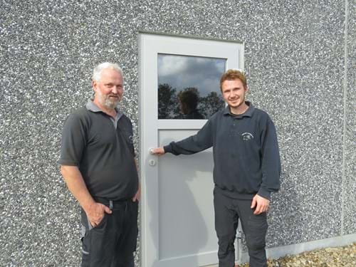 Jan og Jens Have ved deres nye klimastald med 7.100 stipladser. Da det var afklaret, at Jens Have (til højre) skulle være medejer af forældrenes bedrift, blev det besluttet at bygge den nye klimastald på bar mark.