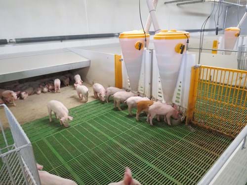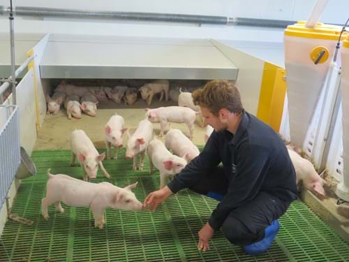 Grisene indsættes i den nye klimastald ved 6-7 kg. Her skal de gå i otte uger, indtil de flyttes over i en af bedriftens slagtegrisestalde.